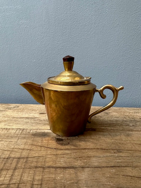A beautiful, vintage brass and teak coffee and tea set. 5 pieces of brass and and teak with subtle patina that I love. I didn't polish it as that is a personal preference. Coffee pot, tea pot, creamer, sugar bowl and outstanding tray. Would look fabulous on display! The inside looks great.