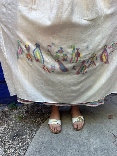 100% handwoven cotton with handmade button holes and an internal slip that amplifies the beauty of the bottom of the dress and the way it's woven.