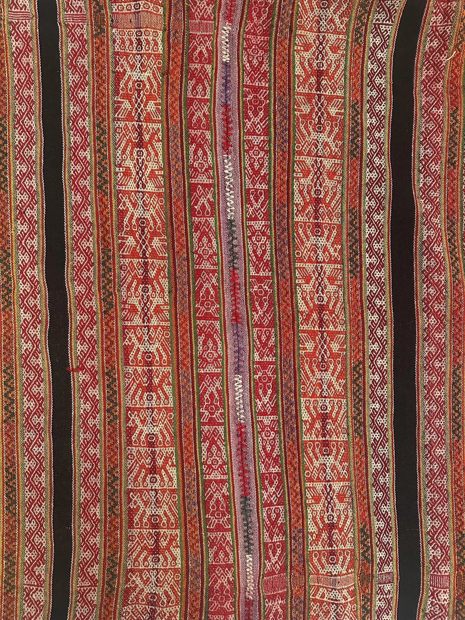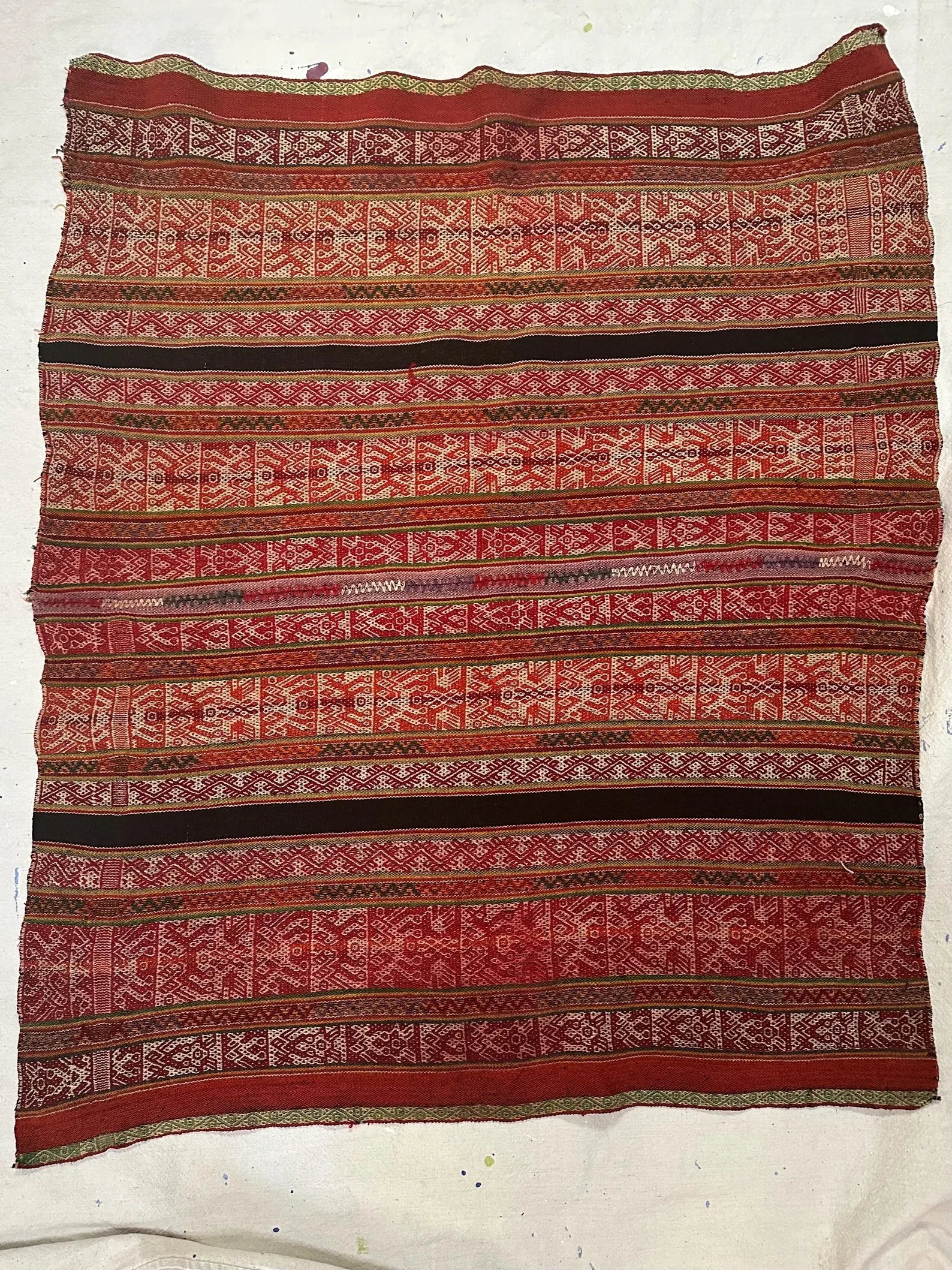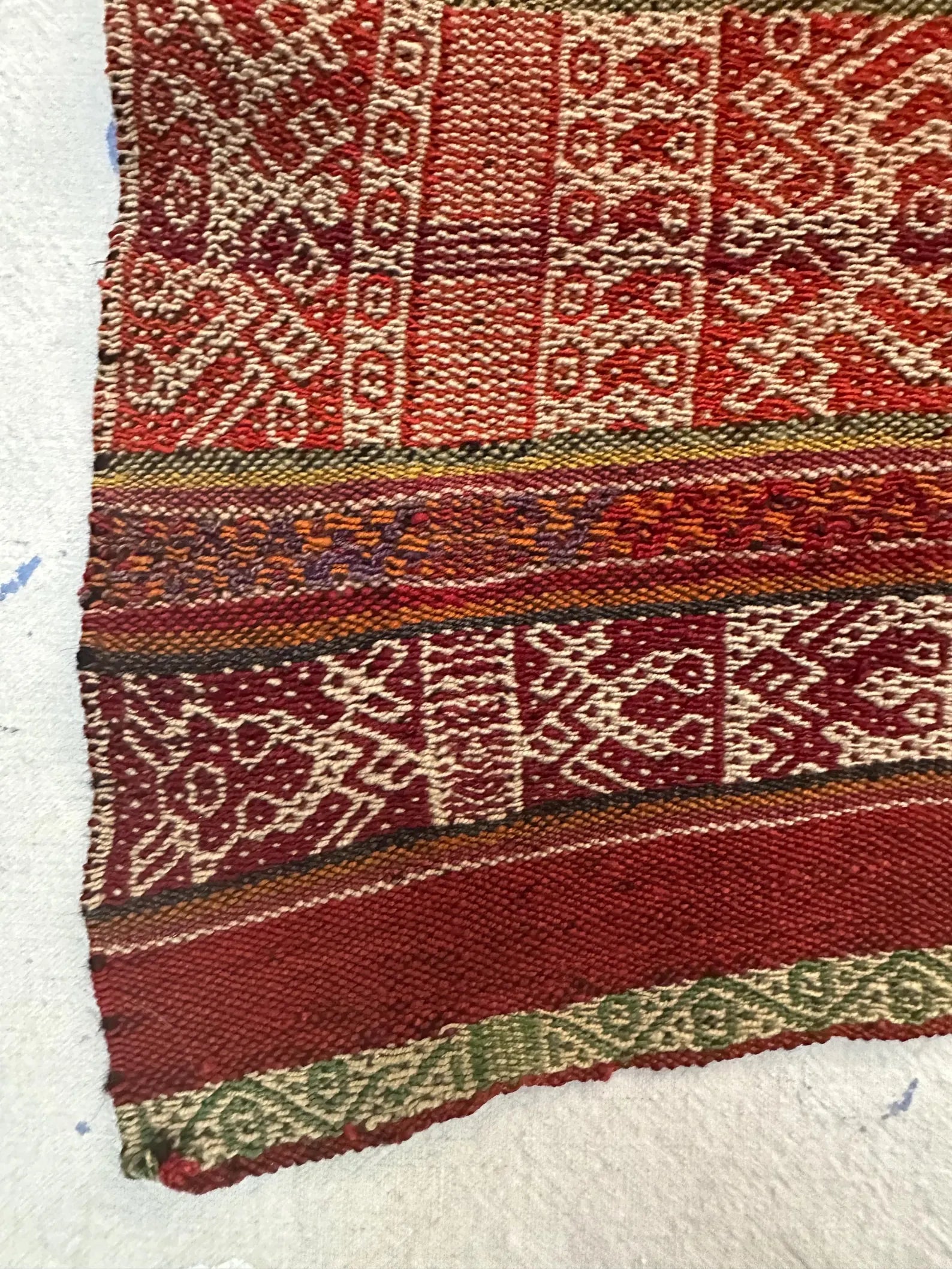 A handwoven multi-colored manta textile design in red, rust, green, and black with other subtle hues including lavender. The intricate handwoven craftsmanship showcases the rich culture and heritage of Peru textiles, making it a collectible for enthusiasts of Latin American art and textiles. Made of high-quality wool, this manta is not only a beautiful piece but also durable and long-lasting.
